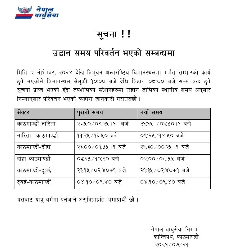 त्रिभुवन अन्तर्राष्ट्रिय विमानस्थलमा भोलि कात्तिक २३ गतेबाट मर्मतसम्भारको काम सुरु हुने भएकोले नेपाल एयरलाइन्सले नारिता, दोहा र दुबईको उडान समय परिवर्तन गरेको हो। भोलिबाट त्रिभुवन विमानस्थल राति १० बजेदेखि बिहान ८ बजेसम्म बन्द रहनेछ।