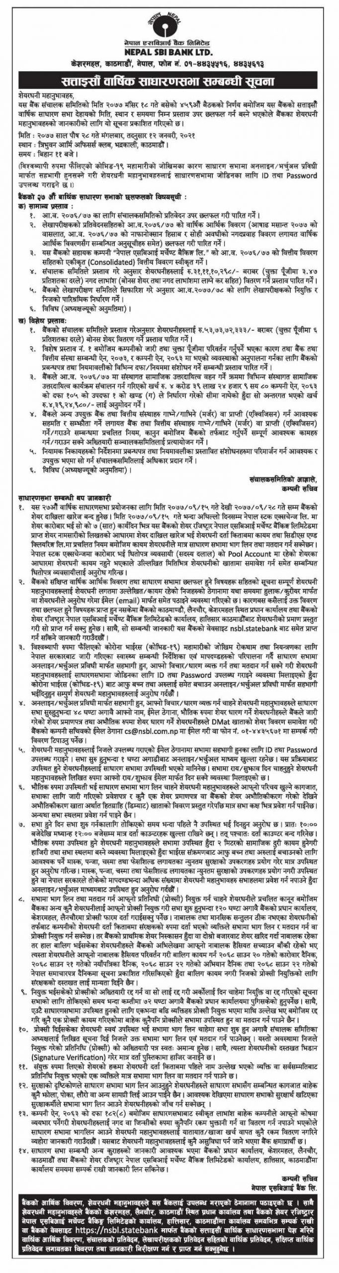 काठमाडौं । नेपाल एसबिआई बैंक लिमिटेडले वार्षिक साधारण सभा आह्वान गरेको छ । बैंकको मंसिर १८ गते बसेको सञ्चालक समितिको बैठकले गरेको निर्णय अनुसार बैंकको २७औं वार्षिक साधारण सभा पुस २८ गते, मंगलबार, त्रिभुवन आर्मि अफिसर्स क्लब, भद्रकाली, काठमाडौँमा बिहान ११ बजेबाट भर्चुअल माध्यममार्फत सञ्चालन हुने बैंकले जनाएको छ ।