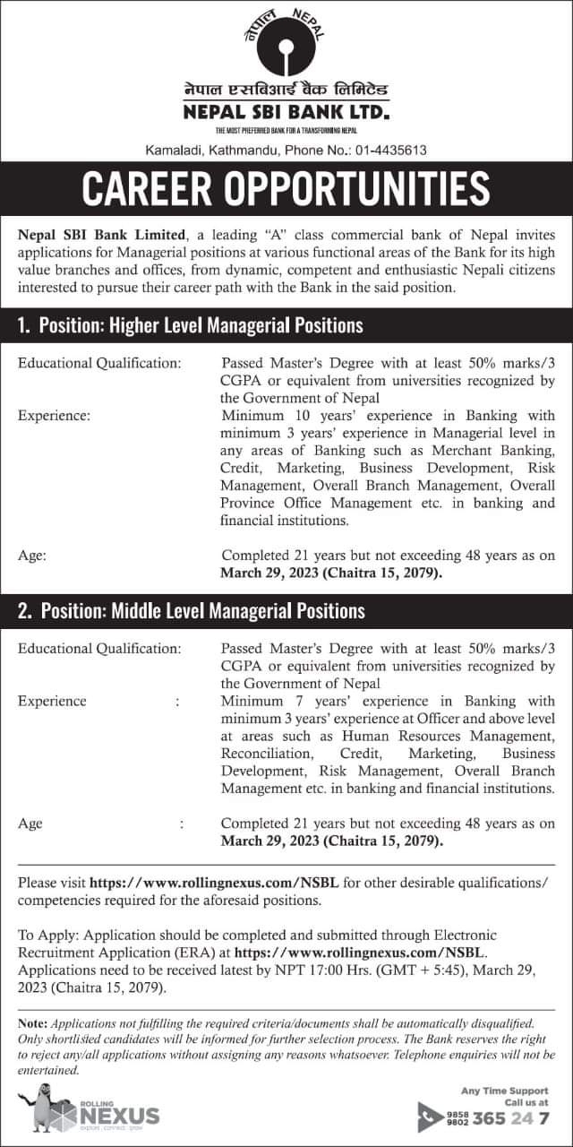 काठमाडौं । नेपाल एसबिआई बैंकले कर्मचारीको माग गरेको छ । बैंकले हाइएर लेभल म्यानेजरियल पोजिशनका लागि र मिडिल लेभल म्यानेजरियल पोजिशनका लागि कर्मचारीको माग गरेको हो । बैंकले आफ्नो हेड अफिसका लागि र विभिन्न शाखा कार्यालयका लागि कर्मचारीको माग गरेको हो । ईच्छुक तथा योग्यता पुगेकाले चैत १५ गतेभित्र आवेदन दिनुपर्नेछ ।