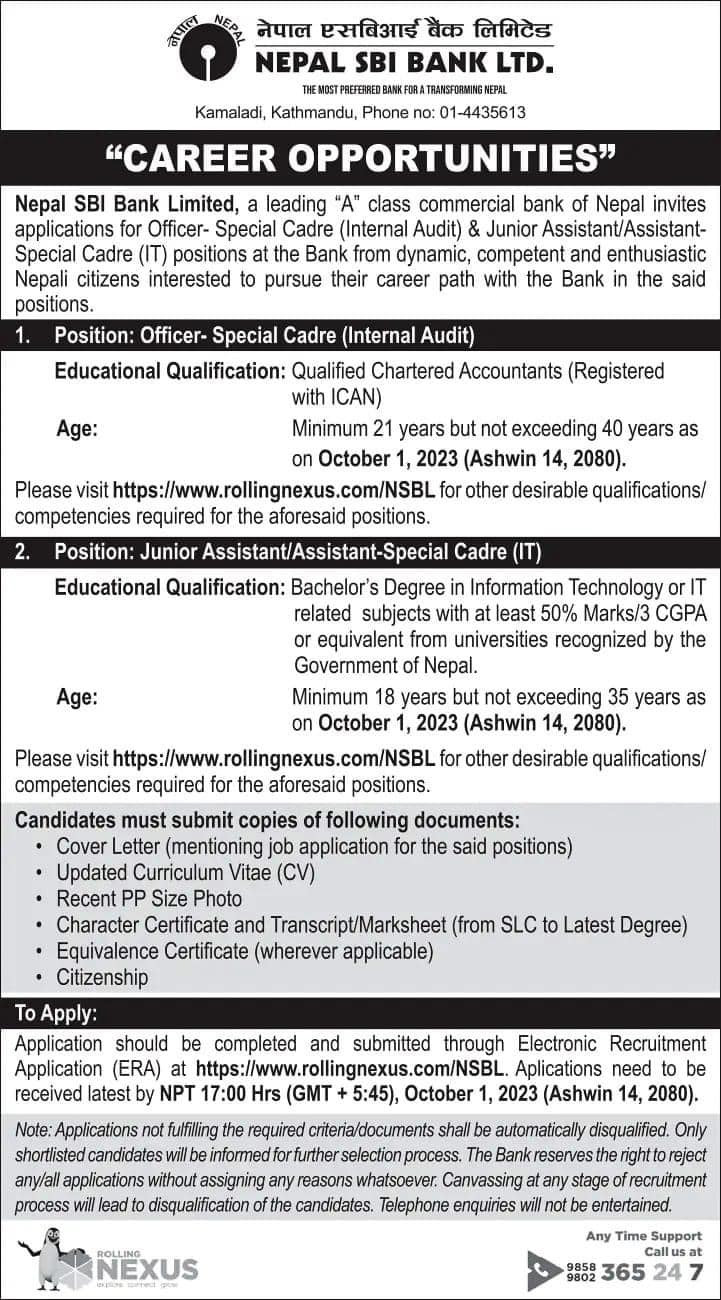 काठमाडौं । नेपाल एसबिआई बैंकले कर्मचारी माग गरेको छ । बैंकले अफिसर लेभलमा अडिटकालागि केही, जुनियर असिस्टेन्ट र असिस्टेन्ट लेभलका आइटीका लागि केही संख्यामा कर्मचारी माग गरेको छ । कम्पनीले सम्बन्धीत क्षेत्रमा ज्ञान भएको हुनुपर्ने जनाएको छ । ईच्छुक तथा योग्यता पुगेकाले साउन १४ गतेभित्र आवेदन दिन सक्नेछन् ।