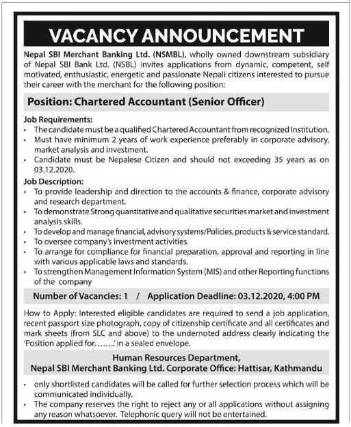 काठमाडौँ । नेपाल एसबिआई मर्चेण्ट बैंकिङ्ग लिमिटेडले कर्मचारी माग गरेको छ । कम्पनीले सिनियर चार्टर्ड एकाउण्टेन्टस् पदको लागि कर्मचारी माग गरेको जनाएको छ ।