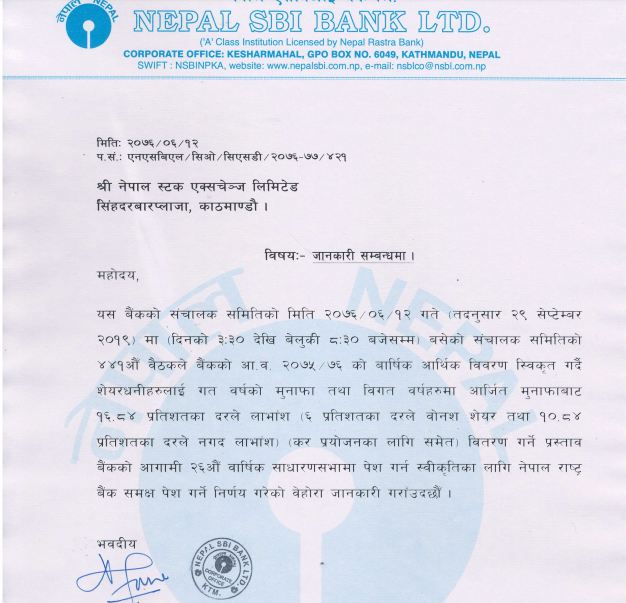 नेपाल एसबीआई बैंकद्धारा लाभांश प्रस्ताव