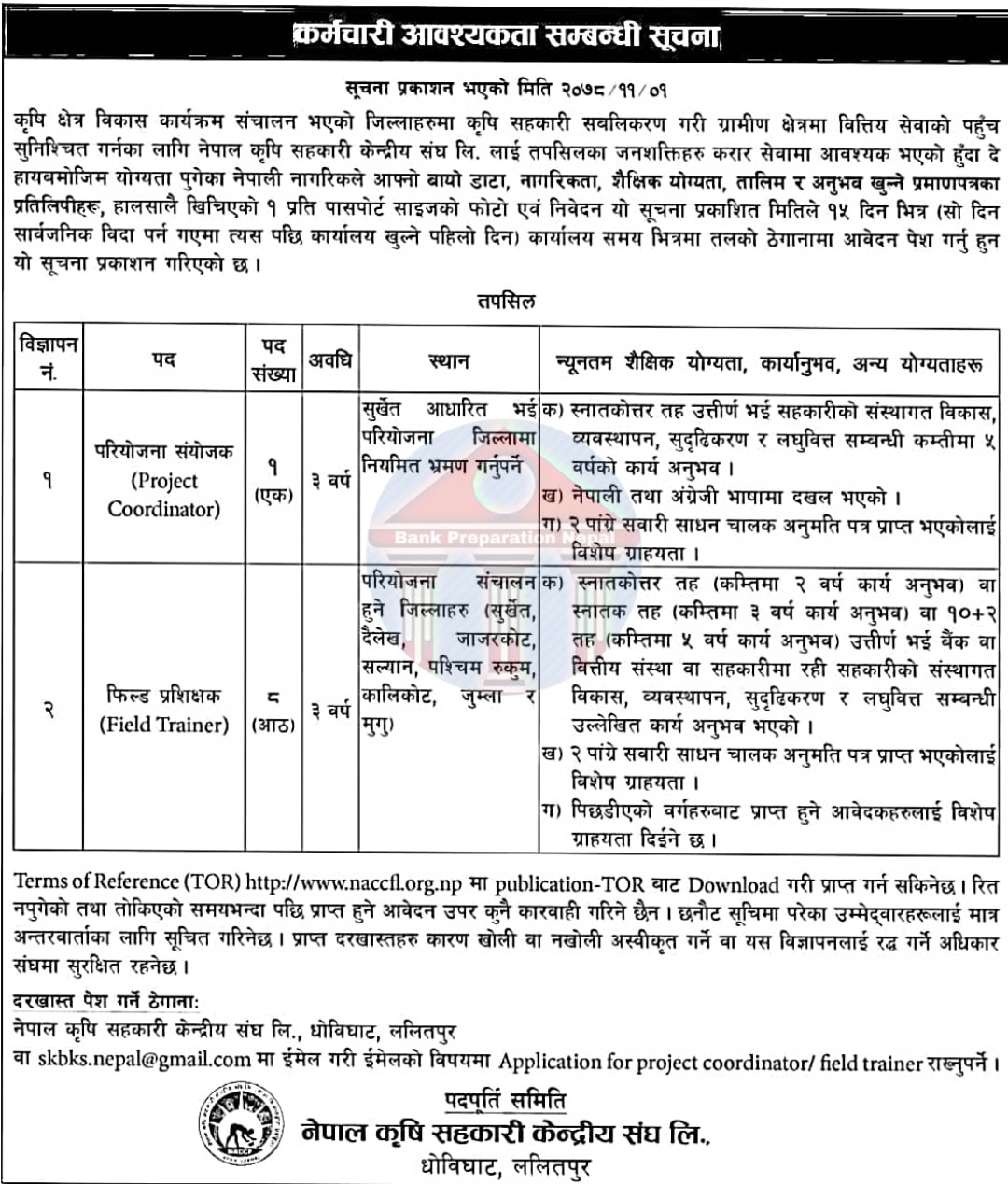 काठमाडौं । नेपाल कृषि सहकारी केन्द्रीय संघले विभिन्न पदका लागि कर्मचारीको माग गरेको छ । संघले परियोजना संयोजकका लागि १ जना र फिल्ड प्रशिक्षकका लागि ८ जना कर्मचारीबो माग गरेको छ । संघले जम्मा ९ जना कर्मचारीको माग गरेको हो ।