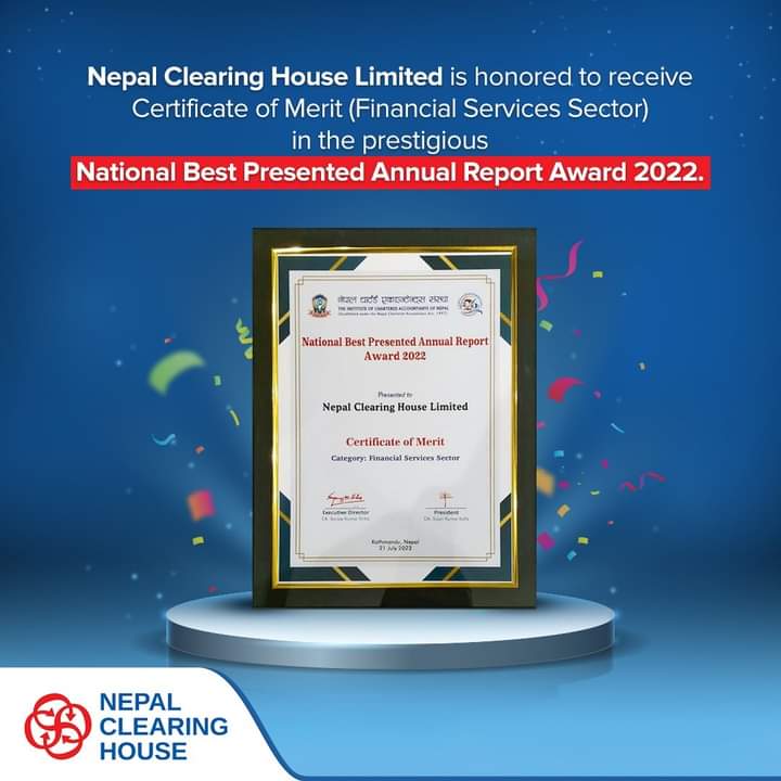 काठमाडौं । नेपाल क्लियरिङ्ग हाउस लि. (एनसीएचएल) लाई नेशनल बेष्ट प्रिजेन्टड अवार्ड अन्तर्गत सन् २०२२ का लागि फाइनान्सियल सर्भिसेस् क्षेत्रको विधातर्फ “सर्टिफिकेट अफ मेरिट” प्रदान गरिएको छ । एनसीएचएलले आर्थिक वर्ष २०७८/७९ को लागि सार्वजनिक गरेको वार्षिक प्रतिवेदनको आधारमा चार्टड अकाउन्टेन्ट अफ नेपाल द्वारा संचालन गरिएको वार्षिक कार्यक्रममा सो पुरष्कार प्रदान गरिएको हो ।