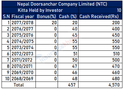 १० वर्ष अघि नेपाल टेलिकमको १० कित्ता शेयर हुने लगानीकर्ताले रु. ४ हजार ५७० नगद लाभांश बुझेका छन् । ( लाभांशमा लाग्ने कर भने घटाईएको छैन ) भने आर्थिक वर्ष ७७/७८ मा कम्पनीले दिएको बोनस शेयर जोड्दा १० कित्ता शेयर १२ कित्ता पनि पुगेको छ ।