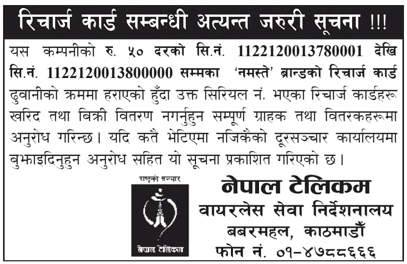 काठमाडौंबाट भैरहवा पठाउने क्रममा ‘नमस्ते’ ब्रान्डका रिचार्ज कार्ड हराएको जनाएको छ । सूचनामा उल्लेख भएअनुसार सिरियल नम्बर ११२२१२००१३७८०००१ देखि ११२२१२००१३८००००० सम्मका २० हजार थान रिचार्ज कार्ड हराएको छ।