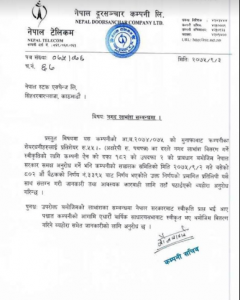 नेपाल टेलिकमले प्रति शेयर ५५ रुपैया नगद लाभांश प्रस्ताव गरेको छ । सोमबार बसेको सञ्चालक समितिको ८०२ औ बैठकले गत आवको मुनाफा बाट आफ्ना लगानीकर्ताहरु लाई सो बराबारको लाभांश दिने निर्णय गरेको छ ।