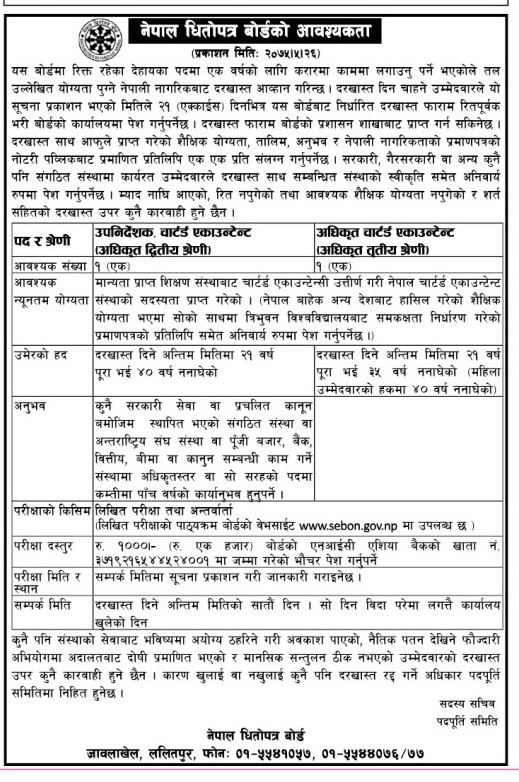 नेपाल धितोपत्र बोर्डले विभिन्न पदमा एक बर्षको लागि करारमा कर्मचारी माग गरेको छ । बोर्डले उपनिर्देशक चार्टर्ड एकाउण्टेण्ट अधिकृत द्वितीय श्रेणी र अधिकृत चार्टर्ड एकाउण्टेण्ट अधिकृत द्वितीय श्रेणी १ /१ जना कर्मचारी माग गरेको छ। इच्छुक र योग्य नागरिकले दर्खास्त दिन सक्नेछन ।