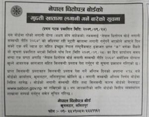 नेपाल धितोपत्र बोर्ड लगानी सम्बन्धी नीति २०६७ को अधिनमा रहि मुद्धती खातामा लगानी गर्नुपर्ने भएकोले इच्छुक बैंकलाई सूचना जारी भएको ५ दिनभित्र कार्यालय समय भन्दा एक घण्टा अगाडी योग्यता खुल्ने आवश्यक कागजात सहित सिलबन्दी प्रस्ताव गर्न बोर्डले आह्वा गरेको हो ।