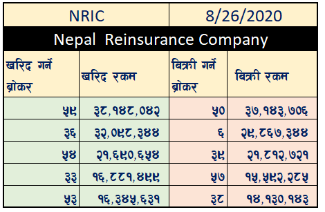 कम्पनीको आजको फ्लोरसिट हेर्दा  खरिद गर्ने ब्रोकर नै आक्रामक भएको देखिन्छ । नेपाल पुनर्बीमाको सबै भन्दा धेरै ५९ नम्बर ब्रोकरबाट सर्वाधिक  ३ करोड ८१ लाख बराबरको शेयर खरिद भएको छ भने ५० नम्बर ब्रोकरबाट सर्वाधिक ३ करोड ७१ लाख बराबरको शेयर बिक्री भएको छ।