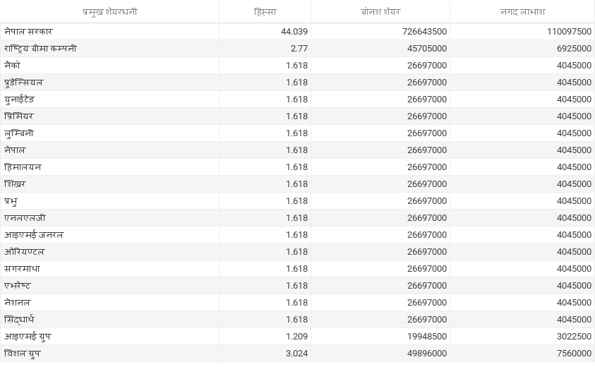 बीमा कम्पनीहरु मध्ये सबैभन्दा धेरै हिस्सा रहेको राष्ट्रिय बीमा कम्पनीले ४ करोड ५७ लाख रुपैयाँ बोनश शेयर, ६९ लाख २५ हजार नगद सहित ५ करोड २६ लाख रुपैयाँ लाभांश पाउनेछ । बाँकी पुराना निर्जीवन बीमा कम्पनीहरुको हिस्सा बराबर रहेको हुँदा उनिहरुले २ करोड ६६ लाख रुपैयाँको बोनश शेयर र ४० लाख ४५ हजार नगद सहित जम्मा ३ करोड ७ लाख रुपैयाँ लाभांश पाउने छन् । गत वर्ष प्राथमक शेयर खरिद गरेका सर्वसाधारणले पनि बोनश शेयर र नगद लाभांश पाउने छन् ।