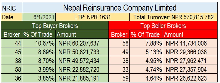 नेपाल पुनर्बीमा कम्पनीको आजको फ्लोरसिट हेर्दा  खरिद गर्ने ब्रोकर नै  थोरै आक्रामक भएको देखिन्छ। ब्रोकर नम्बर ४४ बाट नेपाल पुनर्बीमाको सर्वाधिक ६ करोड बराबरको शेयर खरिद भएको छ सो ब्रोकरबाट आजको कारोवारको १०.६७ % शेयर खरिद भएको छ । त्यस्तै ब्रोकर नम्बर ४५ बाट ५ करोड ८ लाख बराबरको शेयर खरिद भएको छ ।