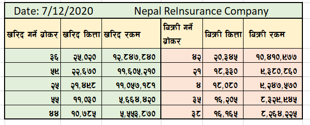 आज नेपाल पुनर्बीमा कम्पनीको ३६ नम्बर ब्रोकरबाट सर्वाधिक १ करोड २८ लाख बराबरको खरिद भएको छ भने ४२ नम्बर ब्रोकरबाट १ करोड ४ लाख बराबरको बिक्री भएको छ ।