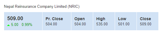 काठमाडौं । नेपाल पुनर्बीमा कम्पनीको शेयर मूल्य सुरुवाती दिन देखिनै निकै चहल पहल देखिएको छ । आज असार २८ गते आईतबार नेपाल पुनर्बीमा कम्पनीको शेयर मूल्यमा सामान्य ५ रुपैयाँले वृद्धि भएर ५०९ रुपैयाँ प्रति कित्तामा कारोवार बन्द भएको छ।