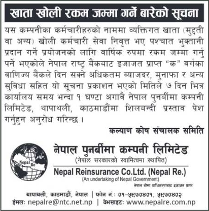 काठमाडौं । नेपाल पुनर्बीमा कम्पनी लिमिटेडले कम्पनीका कर्मचारीहरुको नाममा व्यक्तिगत खाता (मुद्दती वा अन्य) खोली कर्मचारी सेवा निवृत्त भए पश्चात भुक्तानी प्रदान गर्ने भएको छ । सोही प्रयोजनको लागि वार्षिक रुपमा रकम जम्मा गर्नुपर्ने भएकोले नेपाल राष्ट्र बैंकबाट इजाजत प्राप्त ‘क’ वर्गका वाणिज्य बैंकले दिन सक्ने अधिकतम व्याजदर, मुनाफा र अन्य सुविधा सहित सात दिन भित्र शिलबन्दी पेश गर्न कम्पनीले आग्रह गरेको छ ।