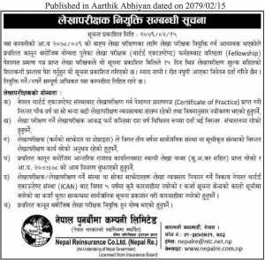 नेपाल पुनर्बीमाले माग्यो लेखापरीक्षक, योग्यता पुगेकालाई आवेदन दिन आग्रह