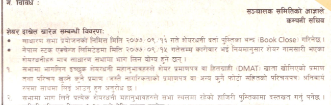 साधारण सभा प्रयोजनको लागि कम्पनीले पुस १६ गतेदेखि बुक क्लोज गर्ने भएको छ। जसका लागि पुस १५ गतेसम्म कायम शेयरधनीले सभामा भाग लिन पाउने छन्।