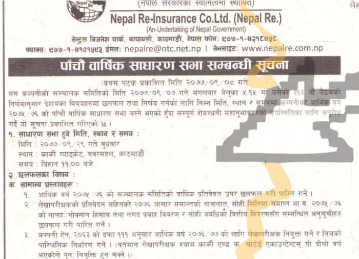काठमाडौं । नेपाल पुनर्बीमा कम्पनीले पाँचौं वार्षिक साधारण सभा पुस २९ गते गर्ने भएको छ । कम्पनीको पुस ७ गते बसेको संचालक समितिको बैठकले उक्त सभाको मिति तय गरेको हो । उक्त सभा कार्की ब्यांक्वीटमा बिहान ११ बजे गर्ने कम्पनीले जनाएको छ ।