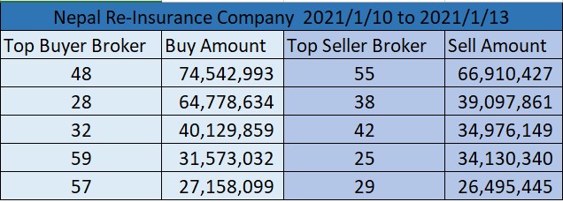 यो साताको फ्लोरसिट हेर्दा नेपाल पुनर्बीमा कम्पनीको ४८ नम्बर ब्रोकरबाट सर्वाधिक खरिद भएको छ भने ब्रोकर नम्बर ५५ बाट सर्वाधिक बिक्रि भएको छ । यो साता कम्पनीको ४८ ब्रोकरबाट ७ करोड ४५ लाख ४२ हजार ९ सय ९३ रुपैयाँको शेयर खरिद भएको छ।