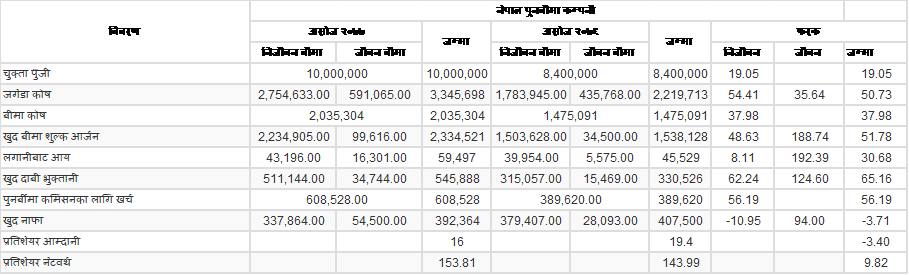 गत वर्ष प्राथमिक शेयर जारी गरेको कम्पनीको चुक्ता पुँजी १० अर्ब पुगेको छ । कम्पनीको जगेडा कोष ५० प्रतिशतले बृद्धि भएर तीन अर्ब ३४ करोड रुपैयाँ पुगेको छ । कम्पनीको बीमा कोष पनि एक वर्षको अवधिमा ३७ दशमलब ९८ प्रतिशतले बढेको छ ।