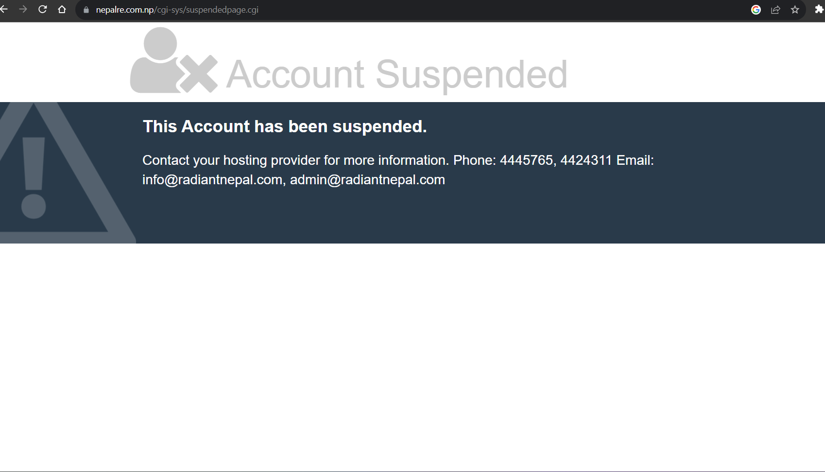 काठमाडौं । सरकारी स्वामित्वको पुनर्बीमा कम्पनी नेपाल पुनर्बीमा कम्पनीको आधिकारिक वेबसाइट बन्द भएकोमा पुनः खुलेको छ। पुनर्बीमा कम्पनीको वेबसाइट डोमेन नविकरण नगर्दा वेबसाइट बन्द हुन पुगेको थियो। वेबसाइट बिहीबार साँझदेखि यथावत सञ्चालनमा आएपनि कम्पनीले वेबसाइट किन बन्द गरिएको थियो भन्ने बारे कुनै जानकारी सार्वजनिक गरेको छैन।