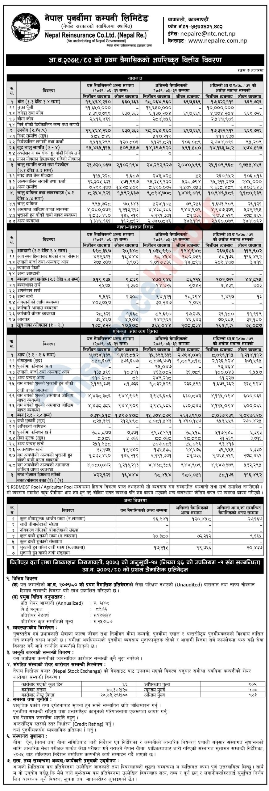 काठमाडौं । नेपाल पुनर्बीमा कम्पनी लिमिटेडले चालु आर्थिक वर्ष ७९/८० को प्रथम त्रैमासको वित्तीय विवरण सार्वजनिक गरेको छ । प्रकाशित वित्तिय विवरण अनुसार ३ महिनामा कम्पनीले निर्जीवन व्यवसायबाट १७ करोड ८४ लाख र जीवन व्यवसायबाट १ करोड ५ लाख खुद नाफा गर्न सफल भएको छ । गत आर्थिक वर्षको प्रथम त्रैमाससम्म कम्पनीले निर्जीवन व्यवसायबाट १६ करोड ४९ लाख र जीवन व्यवसायबाट ७ करोड ५० लाख खुद नाफा गरेको थियो । निर्जीवन व्यवसायबाट हुने नाफा वृद्धि हुँदा जीवन व्यवसायबाट हुने नाफा घटेको छ ।