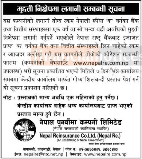 एक वर्ष वा सो भन्दा बढी अवधिको मुद्दती निक्षेपमा लगानी गर्ने जनाएको छ । जसका कम्पनीले लागि नेपाल राष्ट्र बैंकबाट इजाजत प्राप्त ‘क’ वर्गका बैंक तथा वित्तीय संस्थाहरुले लिन चाहेको रकम र ब्याजदर उल्लेख गरी कम्पनीले तोके बमोजिमको कोटेशन सम्बन्धी फाराम भरि सात दिनभित्र गोप्य शिलबन्दी पेश आग्रह गरेको छ ।