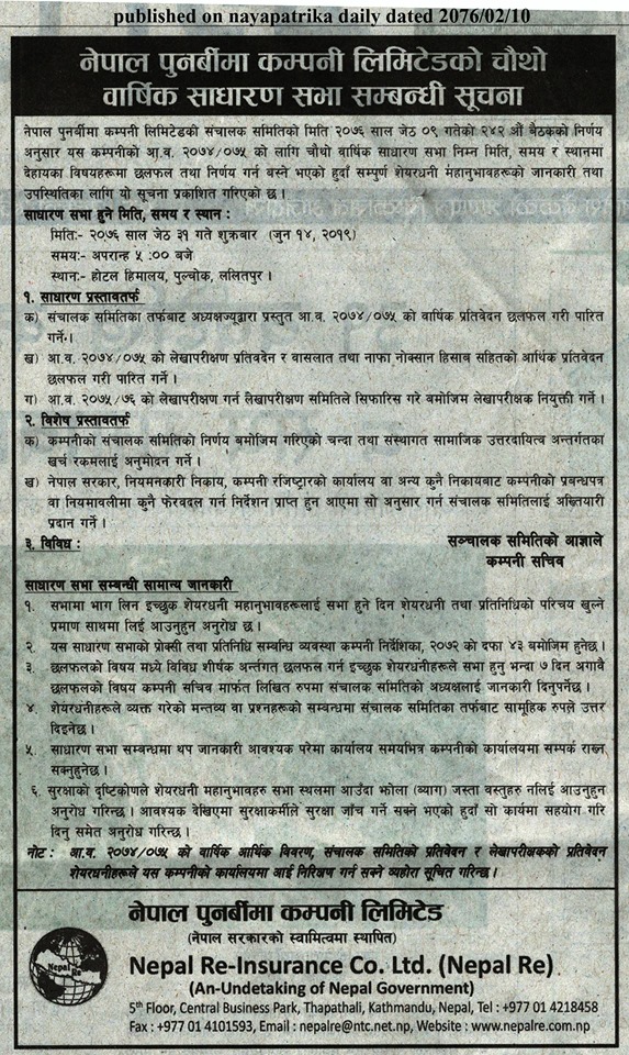 नेपाल पुर्नर्बीमा कम्पनीले जेठ ३१ गते चौथो वार्षिक साधारण सभा गर्ने भएको छ । कम्पनीको जेठ ९ पते बसेको संचालक समितिको बैठकले सो साधारण सभा गर्ने निर्णय गरेको हो ।कम्पनीले होटल हिमालय पुल्चोकमा अपराह्न ५ बजे सभा आह्वान गरेको हो ।