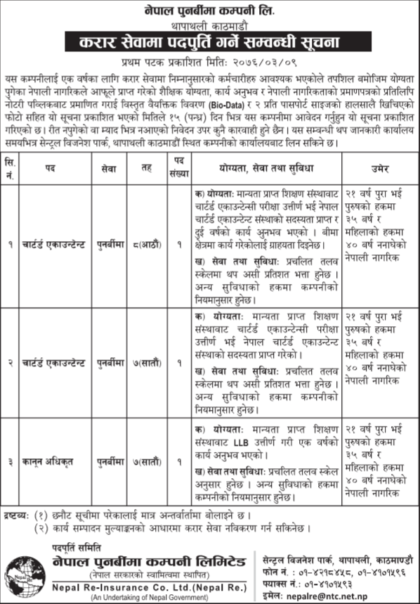 नेपाल पूनर्बीमा कम्पनीले करार सेवामा विभिन्न पदमा कर्मचारी माग गरेको छ । कम्पनीले चार्टर्ड एकाउन्टेन्ट आठौँ तहमा , चार्टर्ड एकाउन्टेन्ट सातौँ तहमा र कानून अधिकृत सातौँ तहमा १/१ जना कर्मचारी माग गरेको हो ।