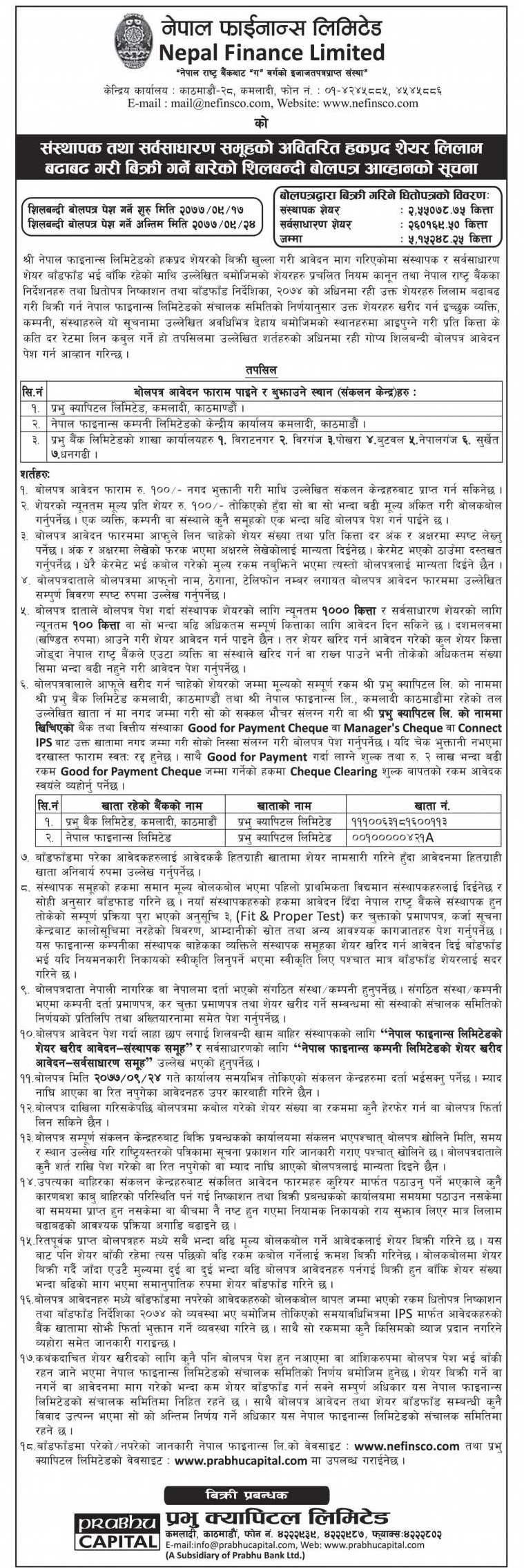 लगानीकर्ताहरुले प्रभु क्यापिटल लिमिटेड, कमलादी काठमाडौँ, नेपाल फाइनान्सको केन्द्रीय कार्यालय कमलादी काठमाडौँ तथा प्रभु बैंक लिमिटेडका विराटनगर, विरगंज, पोखरा, बुटवल, सुर्खेत, नेपालगञ्ज तथा धनगढीका शाखा कार्यालयबाट आवेदन दिन सक्नेछन् ।