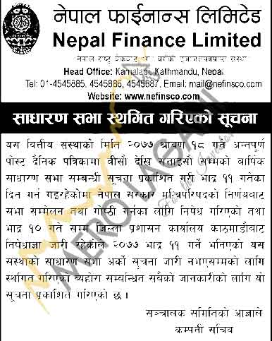 काठमाडौं । नेपाल फाइनान्सको साधारणसभा स्थगित भएको छ । कम्पनीले भदौ ११ गते आइतबार सभा आह्वान गरेकोमा निषेधाज्ञाका कारण सभा स्थगित गरिएको जनाएको छ । कम्पनीले अर्को सूचना जारि नभएसम्मको लागि सभा स्थगित गरेको समेत सोही सुचनामा उल्लेख गरेको छ ।