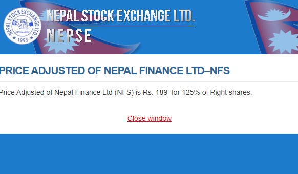 काठमाडौं । नेपाल स्टक एक्सचेञ्जमा नेपाल फाइनान्सको हकप्रद शेयरमा मूल्य समायोजन भएको छ । कम्पनीको १२५ प्रतिशत बोनस शेयर पछि नेप्सेले प्रतिकित्ता १८९ कायम हुने गरी शेयर मूल्य समायोजन गरेको हो ।