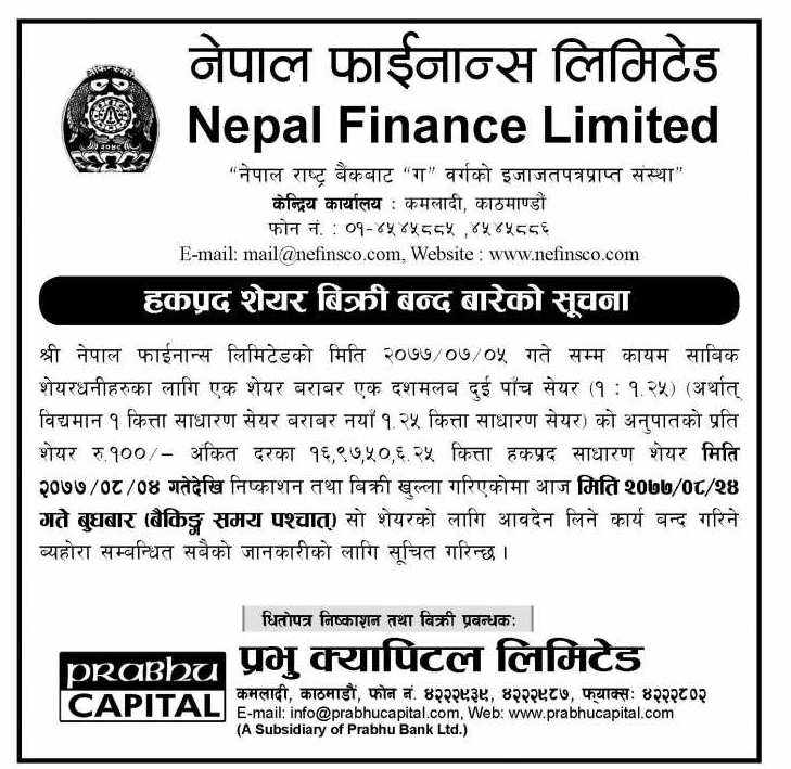 काठमाडौं । नेपाल फाइनान्स कम्पनी लिमिटेडले निष्काशन तथा बिक्री खुला गरेको हकप्रद शेयरमा आवेदन दिने आज अन्तिम दिन रहेको छ । फाइनान्सले चुक्ता पूँजीको १२५ प्रतिशत अर्थात हाल कायम १ कित्ता बराबर नयाँ १.२५ कित्ता अनुपातमा १६ करोड ९७ लाख ५० हजार ६२५ रुपैयाँ बराबरको प्रति शेयर १ सय अंकित दरका १६ लाख ९७ हजार ५ सय ६ दशमलव २५ कित्ता हकप्रद शेयर निष्काशन गरेको हो ।