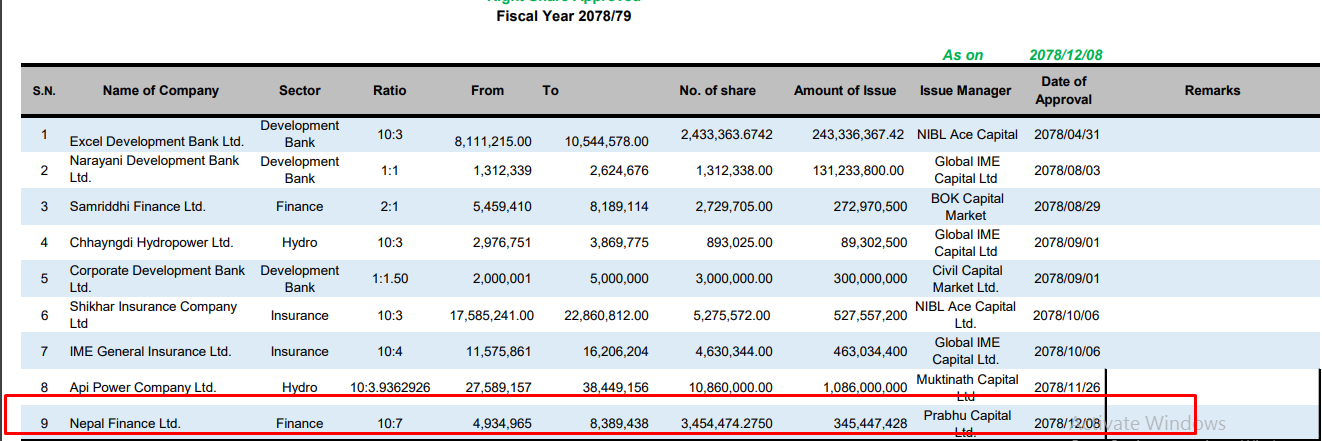 काठमाडौं । नेपाल फाइनान्स लिमिटेडले हकप्रद शेयर निष्काशनको अनुमति पाएको छ । नेपाल धितोपत्र बोर्डले कम्पनीलाई ७० प्रतिशत हकप्रद शेयर निष्काशनको लागि अनुमति प्रदान गरेको हो ।