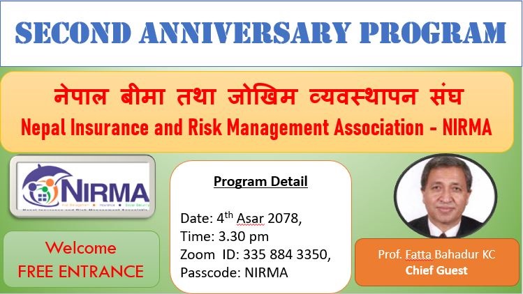 काठमाडौं । नेपाल बीमा तथा जोखिम व्यवस्थापन संघ (निर्मा) दुई वर्ष पुरा गरि तेस्रो वर्षमा प्रेवश गरेको छ । नेपालमा जोखिम व्यवस्थापन, बीमा र सामाजिक सुरक्षाको क्षेत्रमा अध्ययन, अनुसन्धान र प्रकाशन गर्ने, तालीम, सम्मेलन र कन्फरेन्सहरु गर्ने, नीतिगत बिषयमा सम्बन्धित निकायहरुलाई सुझाव दिने, जनचेतना अभिबृद्धिको लागि काम गर्ने उद्देश्यका साथ नेपाल बीमा तथा जोखिम व्यवस्थापन संघ मूनाफा वितरण नगर्ने च्यारिटी संस्थाको रुपमा कम्पनी ऐन अन्तर्गत २०७६ आषाढ ४ गते स्थापना भएको थियो ।