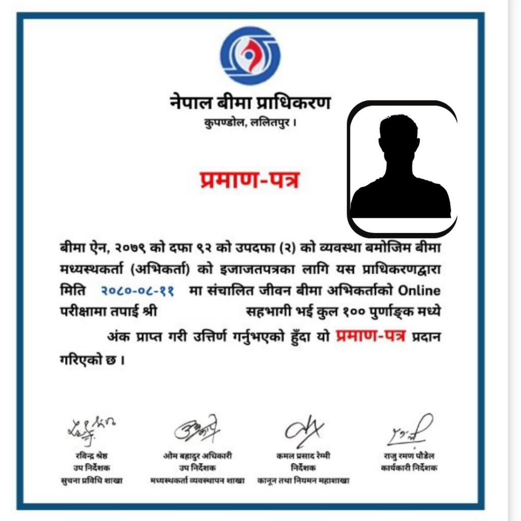 प्राधिकरणले वितरण गरेको प्रमाण पत्रमा बीमा ऐन २०७९ को दफा ९२ उपदफा २ को व्यवस्था बमोजिम बीमा मध्यस्थकर्ता(अभिकर्ता)को इजाजत पत्रका लागि प्राधिकरणद्वारा सञ्चालित जीवन बीमा अभिकर्ताको अनलाइन परिक्षामा सहभागि भई उतीर्णाङ्क प्राप्त गरेकोमा प्रमाण पत्र प्रदान गरिएको उल्लेख छ।
