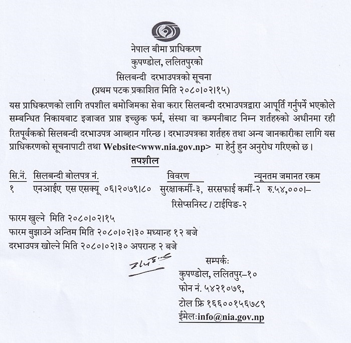 काठमाडौं । नेपाल बीमा प्राधिकरणले करार सेवा सिलबन्दी दरभाउपत्र मार्फत कर्मचारी आपुर्तिका लागि आब्हान गरेको छ । प्राधिकरणले ७ कर्मचारी आपुर्तिका लागि आब्हान गरेको हो । प्राधिकरणले ३ जना सुरक्षाकर्मी, २ जना सरसफाइ कर्मी र रिसेप्सनिष्ट र टाइपिङमा २ जना आपुर्ति गर्न आब्हान गरेको हो । उक्त आपुर्ति फारम जेठ ३० गते १२ बजेभित्र बुझाइसक्नुपर्नेछ । दरभाउपत्र जेठ ३० गते दिउँसो २ बजे खोलिने जनाएको छ ।
