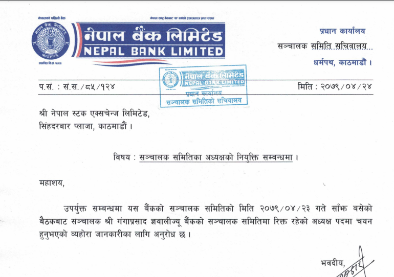काठमाडौं । नेपाल बैंकको सञ्चालक समितिको अध्यक्षमा गंगाप्रसाद ज्ञवाली नियुक्त भएका छन् । बैंकको साउन २३ गते बसेको सञ्चालक समितिको बैठकले ज्ञवालीलाई रिक्त रहेको अध्यक्ष पदमा चयन गरेको हो ।
