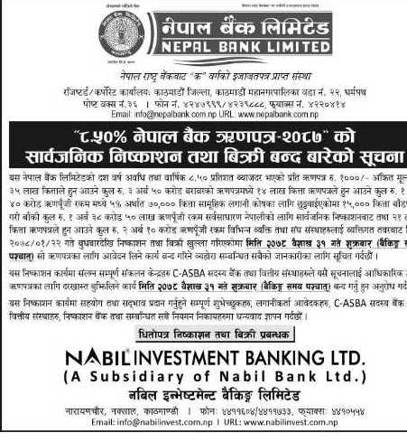 बैंकले १० वर्षे अवधिको ‘८ दशमलव ५ प्रतिशत नेपाल बैंक ऋणपत्र–२०८७’ नामक ऋणपत्र निष्काशन गरेको हो । लगानीकतर्नालाई वार्षिक ८.५ प्रतिशत ब्याज उपलब्ध गराउनेछ।