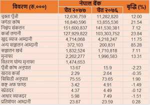 चालु आर्थिक वर्षको ९ महिनाको अवधिमा बैंकले निक्षेप ७.१२ प्रतिशतले बृद्धि गर्दा कर्जा लगानी भने २३.८४ प्रतिशतले विस्तार गर्न सफल भएको छ । बैंकले यहि अवधिमा एक खर्ब ५१ अर्ब रुपैयाँ निक्षेप संकलन गरि एक खर्ब २७ अर्ब रुपैयाँ कर्जा लगानी गरेको छ ।