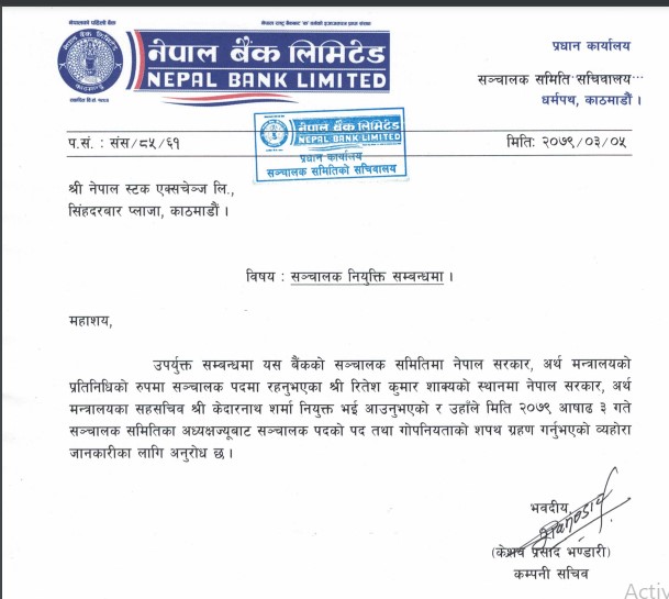 गत असार ३ गते बसेको सञ्चालक समितिको बैठकले शर्मालाई पद तथा गोपनियताको शपथ ग्रहण गराएको कम्पनीले जनाएको छ ।