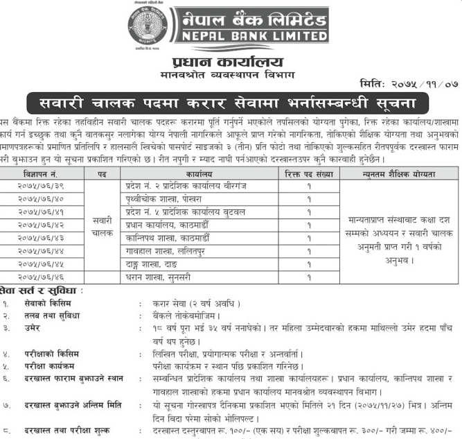 नेपाल बैंक लिमिटेडले विभिन्न शाखा कार्यालयका लागि करारमा सवारी चालक मागेको छ । बैंकले प्रदेश दुईको वीरगंज, गण्डकी प्रदेशको पोखरा, प्रदेश पाँचको बुटवल तथा दाङ, प्रदेश एक को सुनसरी, प्रदेश तीनको प्रधान कार्यालय काठमाडौँ, कान्तिपुर शाखा र ललितपुरको गावहाल शाखाहरुका लागि एक एक जना सवारी चालक करारमा मागेको छ ।