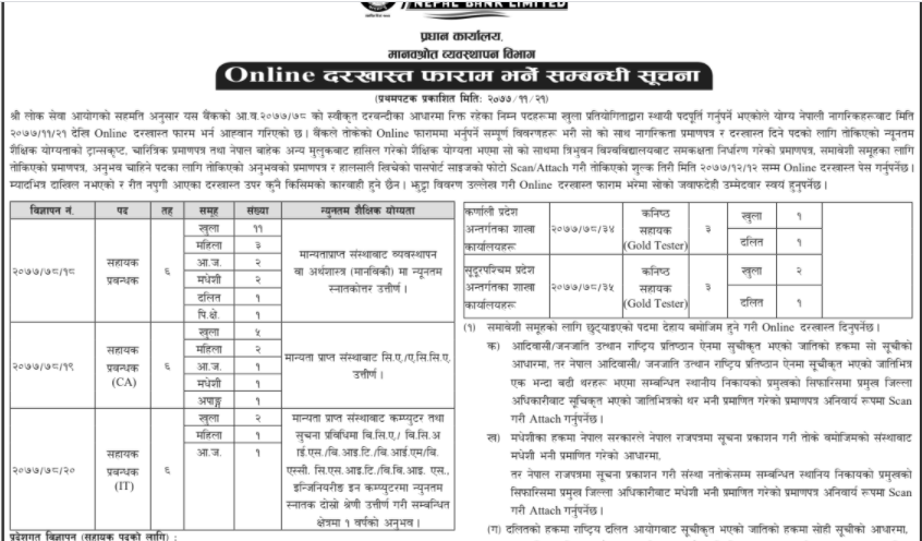 बैंकले सहायक प्रबन्धक, सिएतर्फ सहायक प्रबन्धक, आइटीतर्फ सहायक प्रबन्धक तथा प्रदेशहरू अन्तर्गत सहायकहरू गरी एक सय ९२ पदमा कर्मचारीको लागि आवेदन खुला गरेको छ ।