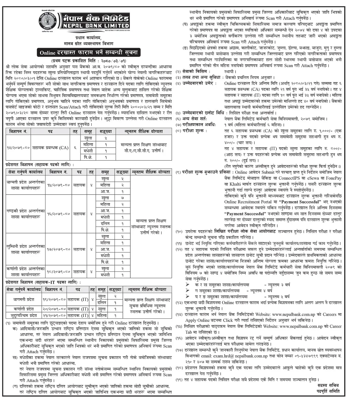 बैंकले खुला प्रतियोगिताद्वारा स्थायी पदपूर्ति गर्न लागेको हो । ईच्छुक तथा योग्य नेपाली नागरिकले आज १ असारदेखि २१ गतेसम्म आवेदन दिन सक्ने बैंकले जनाएको छ । दोब्बर दस्तुर तिरेर थप एक साता असार २८ गतेसम्म आवेदन दिन सकिनेछ । सहायक प्रबन्धक छैटौं तह र सहायक चौथो पदका लागि कर्मचारी माग गरेको हो ।