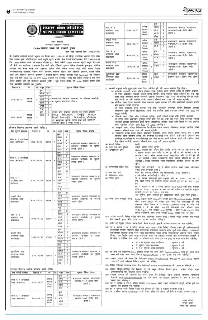 बैंकले सहायक प्रबन्धक पदमा पनि ८० जना कर्मचारी माग गरेको छ । जसमा खुलातर्फ ४३, महिलातर्फ १२, आदिवासी जनजातीमा ९, मधेशी ८ दलितमा ३ जना माग गरेको छ । नेपाल बैंकले कनिष्ठ सहायक पदका लागि ४९ जना कर्मचारी माग गरेको छ । कनिष्ठ सहायक पदका लागि पनि बैंकले प्रदेश अनुसार कर्मचारी माग गरेको छ । उक्त पदमा आवेदन दिन मान्यताप्राप्त संस्थाबाट व्यवसरथापन वा अर्थशास्त्र विषयमा कम्तीमा प्रमाणपत्र तह वा कक्षा १२ उर्तीण गरेको हुनुपर्छ ।आवेदकले उक्त आवेदन मंसिर ६ गतेसम्म अनलाईन मार्फत दिन सक्ने छन् ।