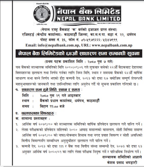 काठमाडौं । नेपाल बैंक लिमिटेडले ६४औं वार्षिक साधारण सभा पुस २९ गते गर्ने भएको छ । सभा बैंकको प्रधान कार्यालय धर्मपथ काठमाडौंमा बिहान ११ बजे शुरु गर्ने जनाएको छ । बैंकको पुस ६ गते बसेको संचालक समितिको बैठकले उक्र सभाको मिति तय गरेको हो । कम्पनीले गत आर्थिक वर्षको मुनाफाबाट लाभांश प्रस्ताव गरेको छैन ।