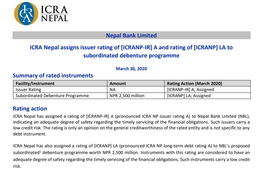 त्यस्तै, नेपाल बैंकले निष्काशन गर्न लागेको डिवेन्चरलाई इक्राले ‘एलए’ रेटिङ दिएको छ । एलए भनेको दीर्घकालिन रुपमा समेत उत्कृष्ट भन्ने अर्थ लाग्नेछ । बैंकले निष्काशन गर्न लागेको २५०० मिलियन रकमको डिवेन्चरले इक्राबाट एलए रेटिङ पाएको हो ।