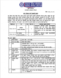 योग्यता पुगेका ईच्छुक आवेदकले यो सुचना गोरखापत्र दैनिकमा प्रथम पटक प्रकाशित भएको मितिले २१ दिन भित्र दरखास्त दिईसक्नु पर्ने छ । दरखास्त फाराम बैंकको प्रधान कार्यालय वा ईमेल ठेगाना बाट प्राप्त गर्ने सक्ने बैंकले जनाएको छ ।