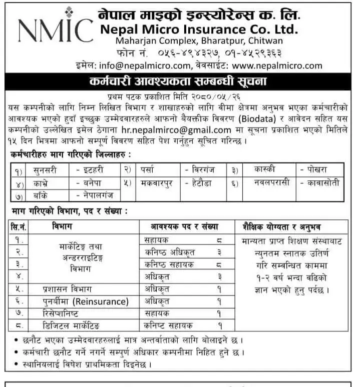 कम्पनीले मार्केटिङ तथा अनडरराइटिङ विभागका लागि सहायकमा ८ जना, कनिष्ठ अधिकृतमा ३ जना, कनिष्ठ सहायकमा ८ जना, अधिकृतमा ३ जना कर्मचारी माग गरेको हो । प्रशासन विभागमा अधिकृतका लागि १ जना, पुनर्बीमा अधिकृतका लागि १ जना, रिसेप्शनिष्टमा सहायकका लागि १ जना र डिजिटल मार्केटिङमा कनिष्ट सहायकका लागि १ जना कर्मचारी गरी कुल २६ जना कर्मचारी माग गरेको हो ।