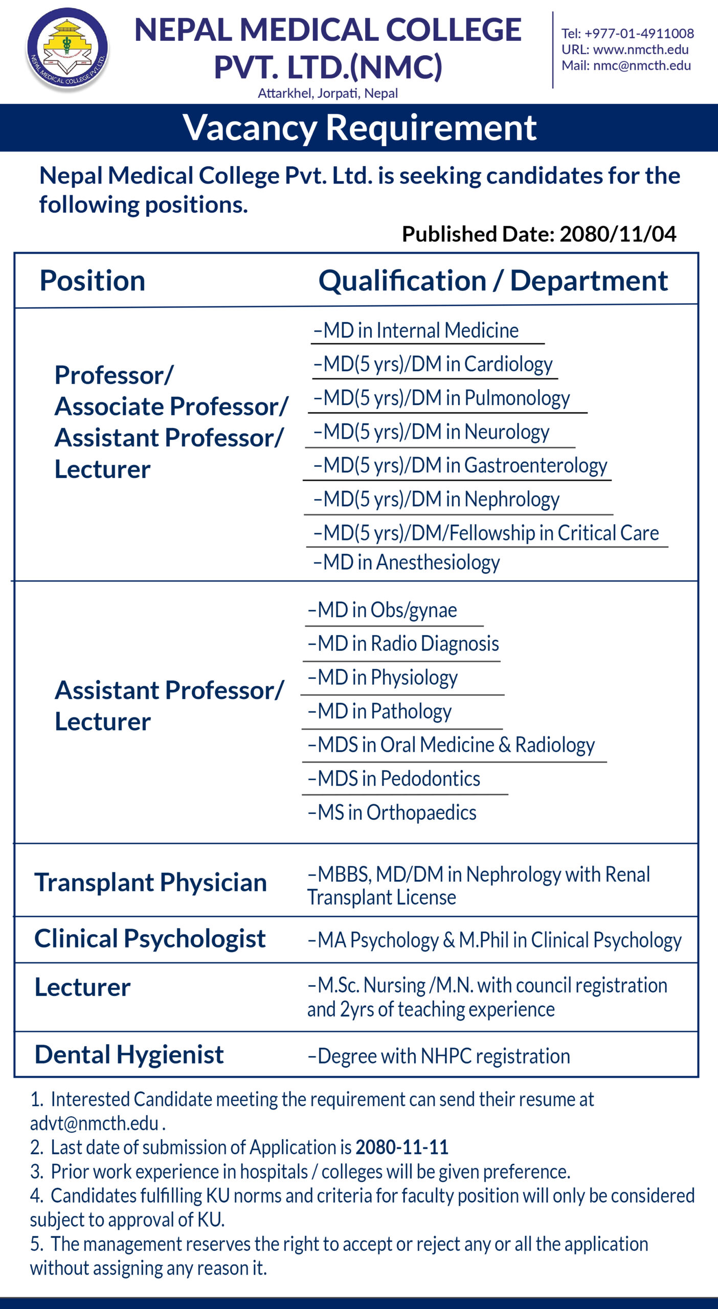 कलेज प्रशासनद्वारा प्रकाशित सूचना अनुसार इन्टरनल मेडिसिन, कार्डियोलोजी, पल्मोनोलोजी, न्यूरोलोजी, ग्यास्ट्रोइन्ट्रोलोजी, नेफ्रोलोजी, क्रिटिकल केयर, एनेस्थेसियोलोजीमा प्रोफेसर, एशोसिएट प्रोफेसर, असिस्टेन्ट प्रोफेसर, लेक्चर माग गरिएको छ ।
